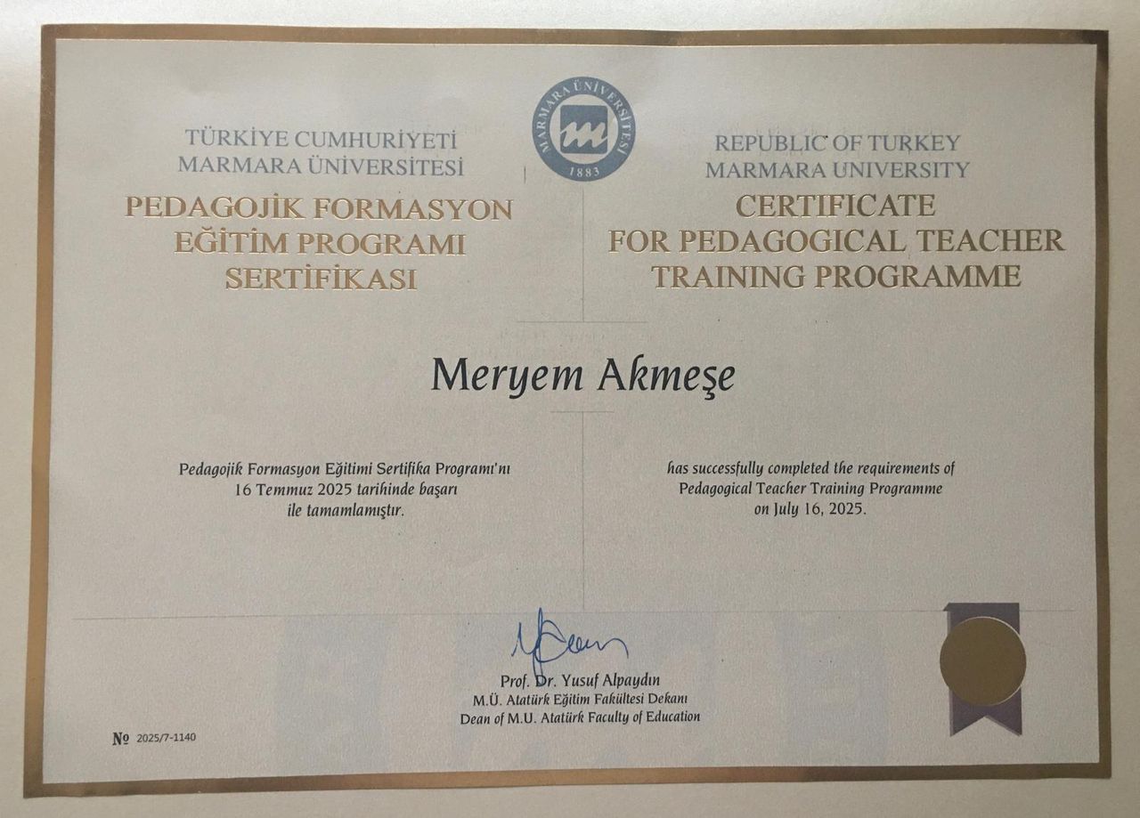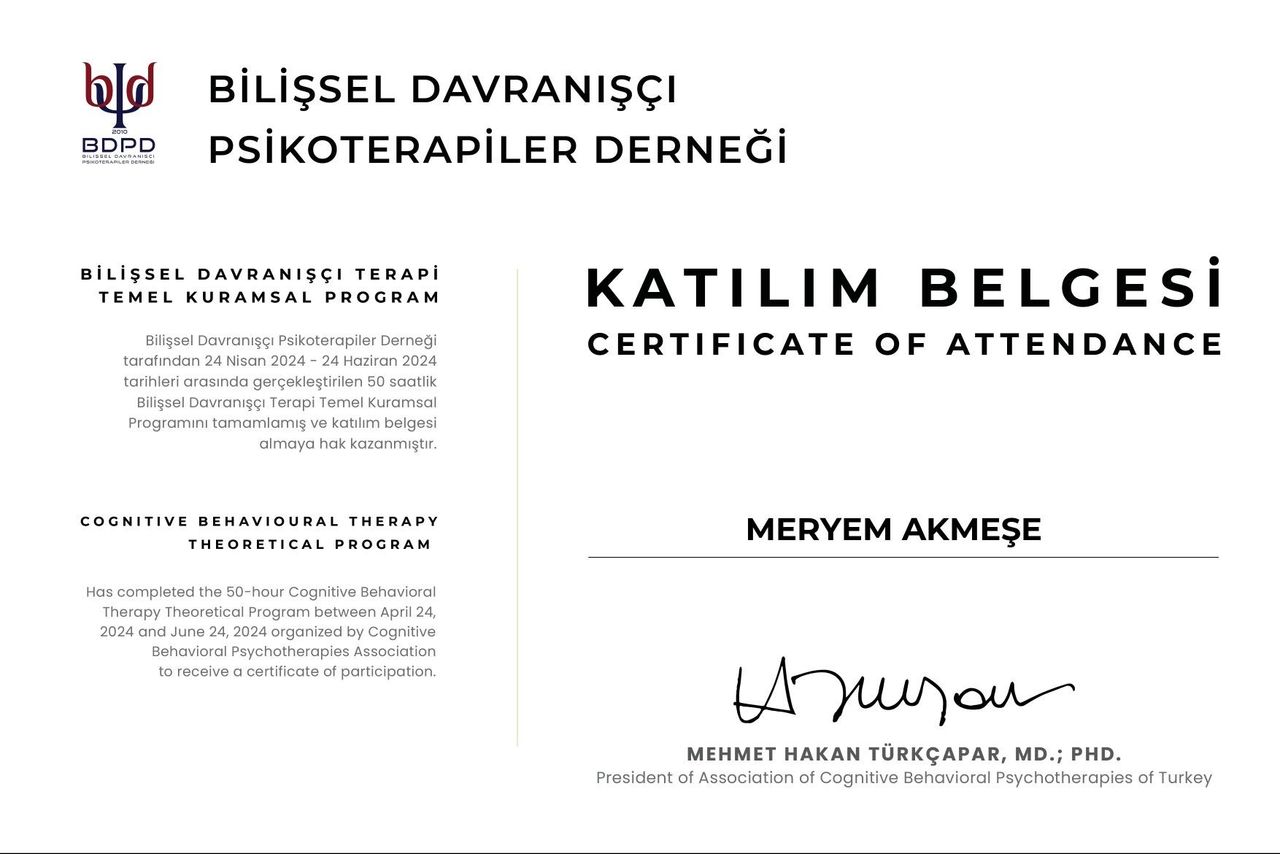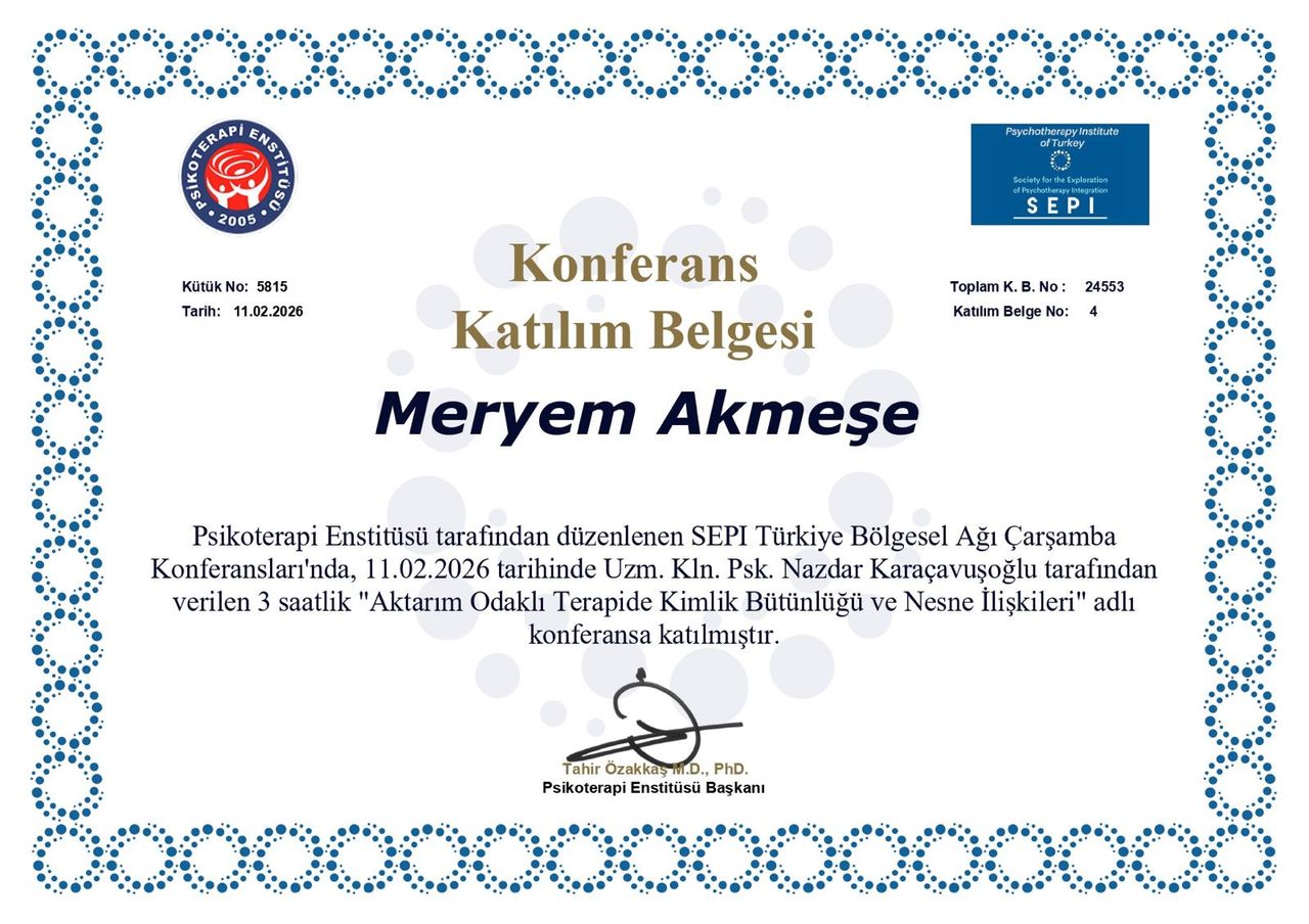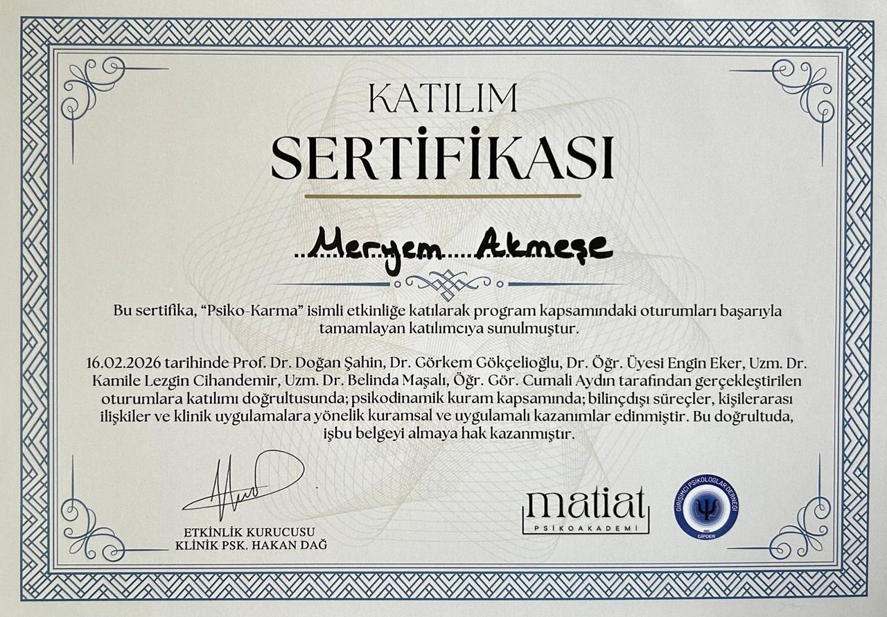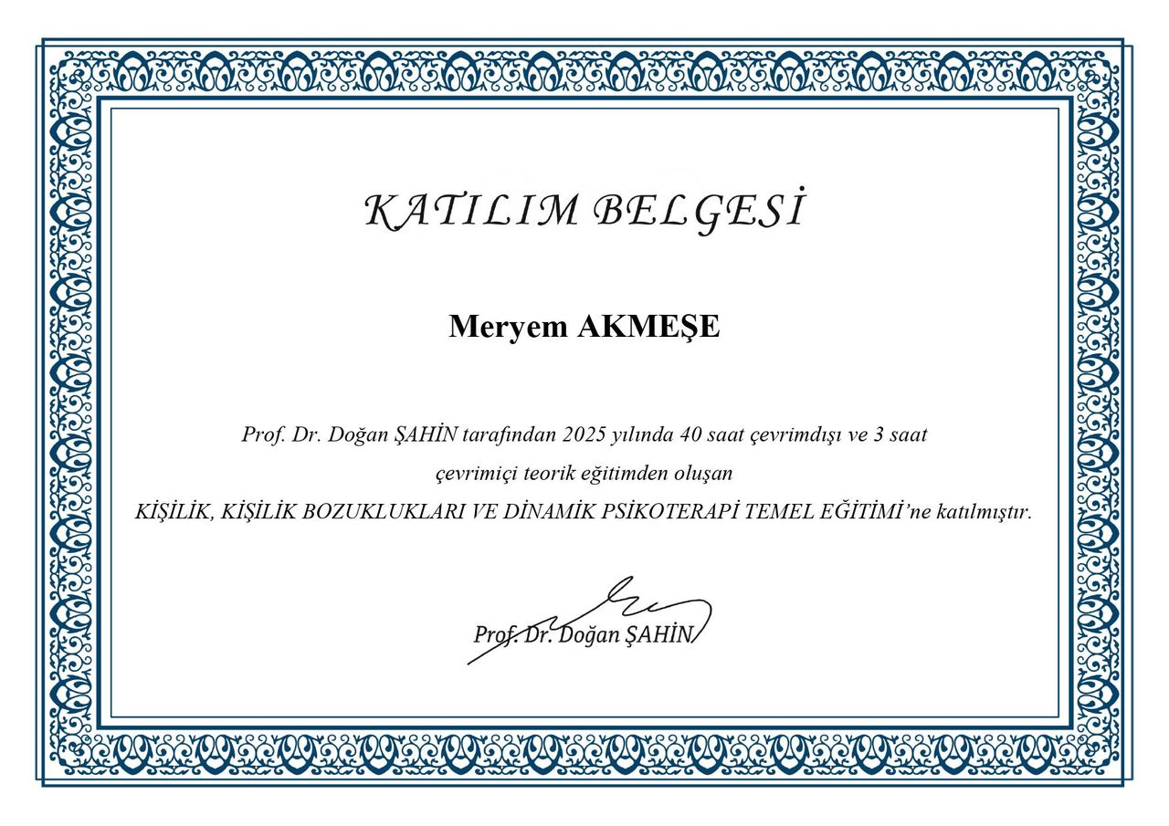 Psikolog Meryem Akmeşe, İstanbul Nişantaşı Üniversitesi Psikoloji Bölümü’nden yüksek onur derecesiyle mezun olmuş olup, lisans eğitiminin ardından akademik ve klinik yetkinliğini derinleştirmek amacıyla İstinye Üniversitesi Klinik Psikoloji Yüksek Lisans Programı’na devam etmektedir. Mesleki gelişimini desteklemek amacıyla, Bakırköy Prof. Dr. Mazhar Osman Ruh Sağlığı ve Sinir Hastalıkları Eğitim ve Araştırma Hastanesi ile İstanbul Büyükşehir Belediyesi İstanbul Aile Danışmanlık ve Eğitim Merkezi (İSADEM) bünyesinde uzun süreli klinik stajlar yapmıştır. Bu kurumlarda edindiği deneyimler sayesinde farklı yaş gruplarından ve çeşitli yaşam öykülerine sahip bireylerle çalışma fırsatı bulmuş; klinik gözlem ve uygulama becerilerini sahada güçlendirmiştir.