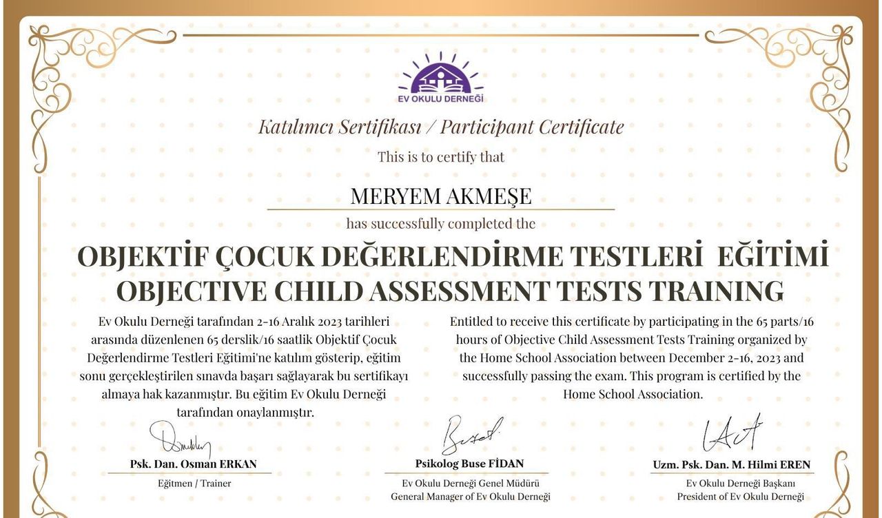 •Objektif Çocuk Değerlendirme Testleri Uygulayıcı Sertifikası-Ev Okulu Derneği